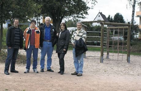 Die Mitglieder der SPD-Arbeitsgruppe Ulrich Christ, Ruth Keller, Helmut Schott, Andreas Theis und Holger Noß (v.r.n.l.) beim Check am Spielplatz "Mozartplatz".